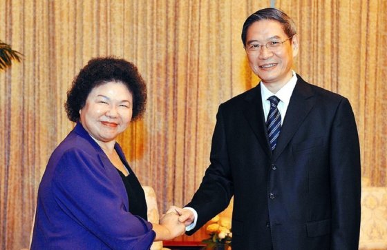 2013年8月,時任高雄市長的陳菊(左)去天津「賣台」,大陸國台辦主任張志軍(右)專程前往會面並共進晚餐。
